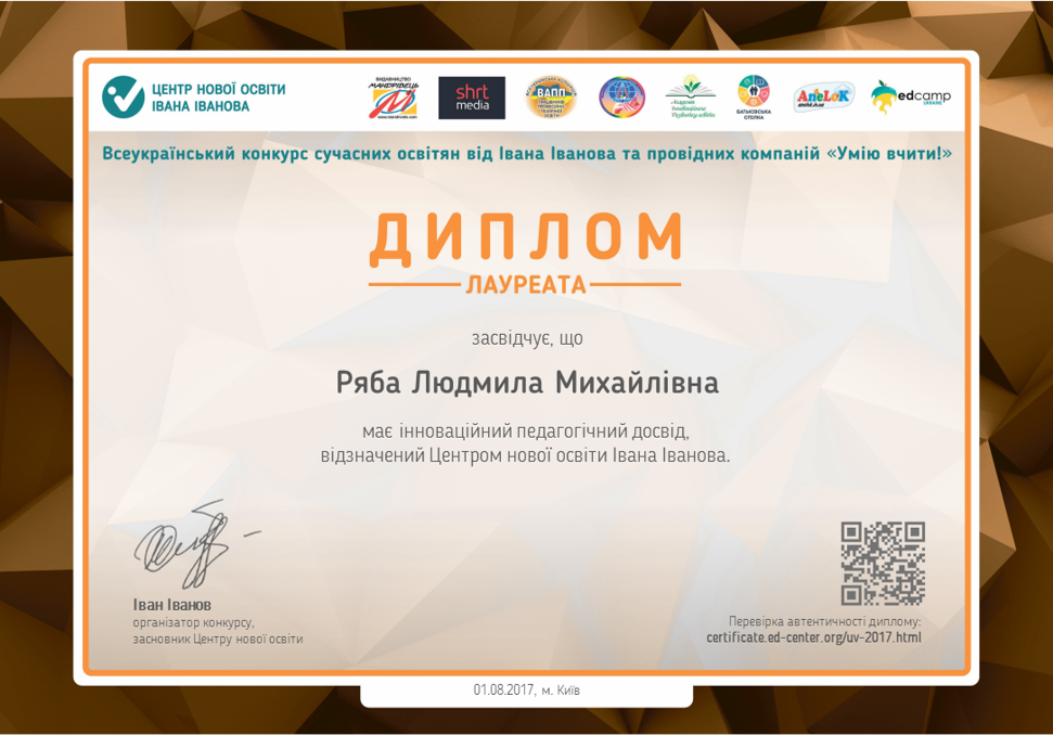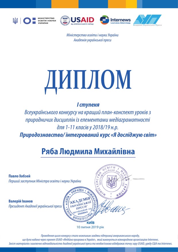 Ряба Людмила Михайлівна. Вчителька початкових класів, тренерка освітніх програм, освіта вища, вища кваліфікаційна категоріяНапрями підвищення кваліфікації: